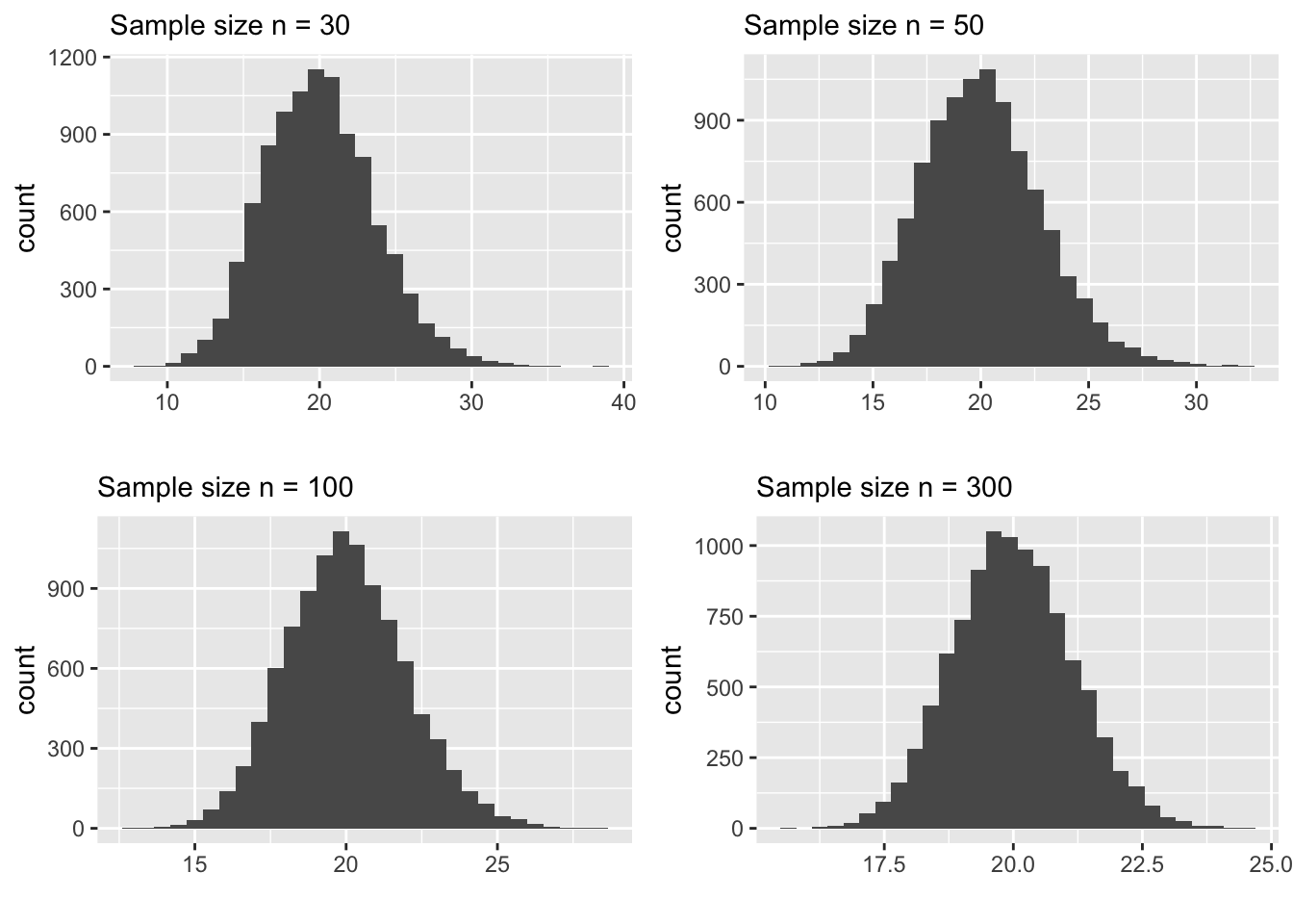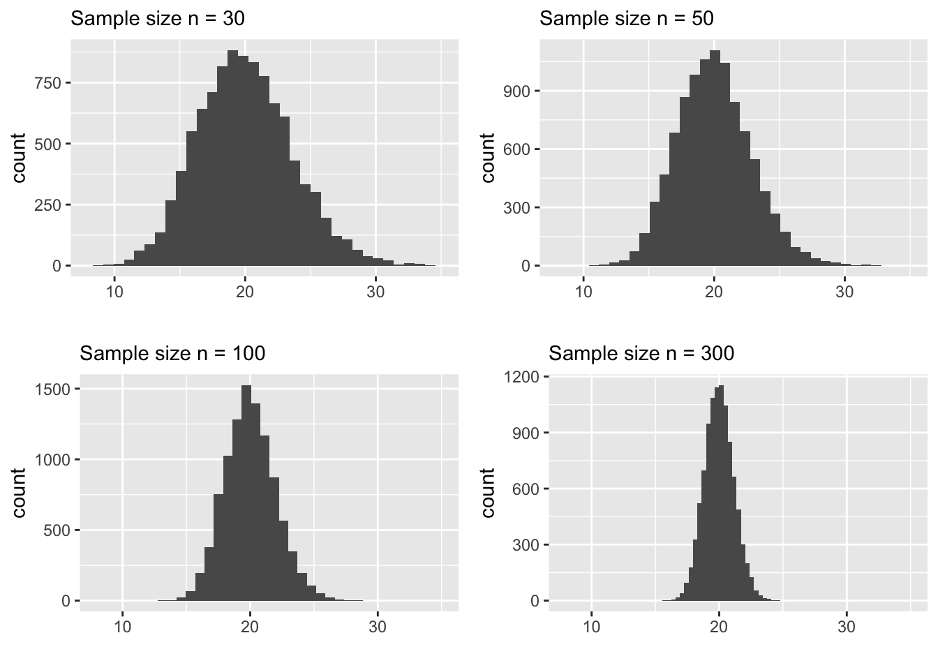 Second, the spread (standard deviation) decreases as \(n\) increases. This is encouraging because it ensures that for larger samples we are not too far off from the “center” of the distribution which happens to be very close to the true mean. The following plot highlights how the sampling distribution concentrates around the true mean by ploting all 4 plots in the same x-scale.