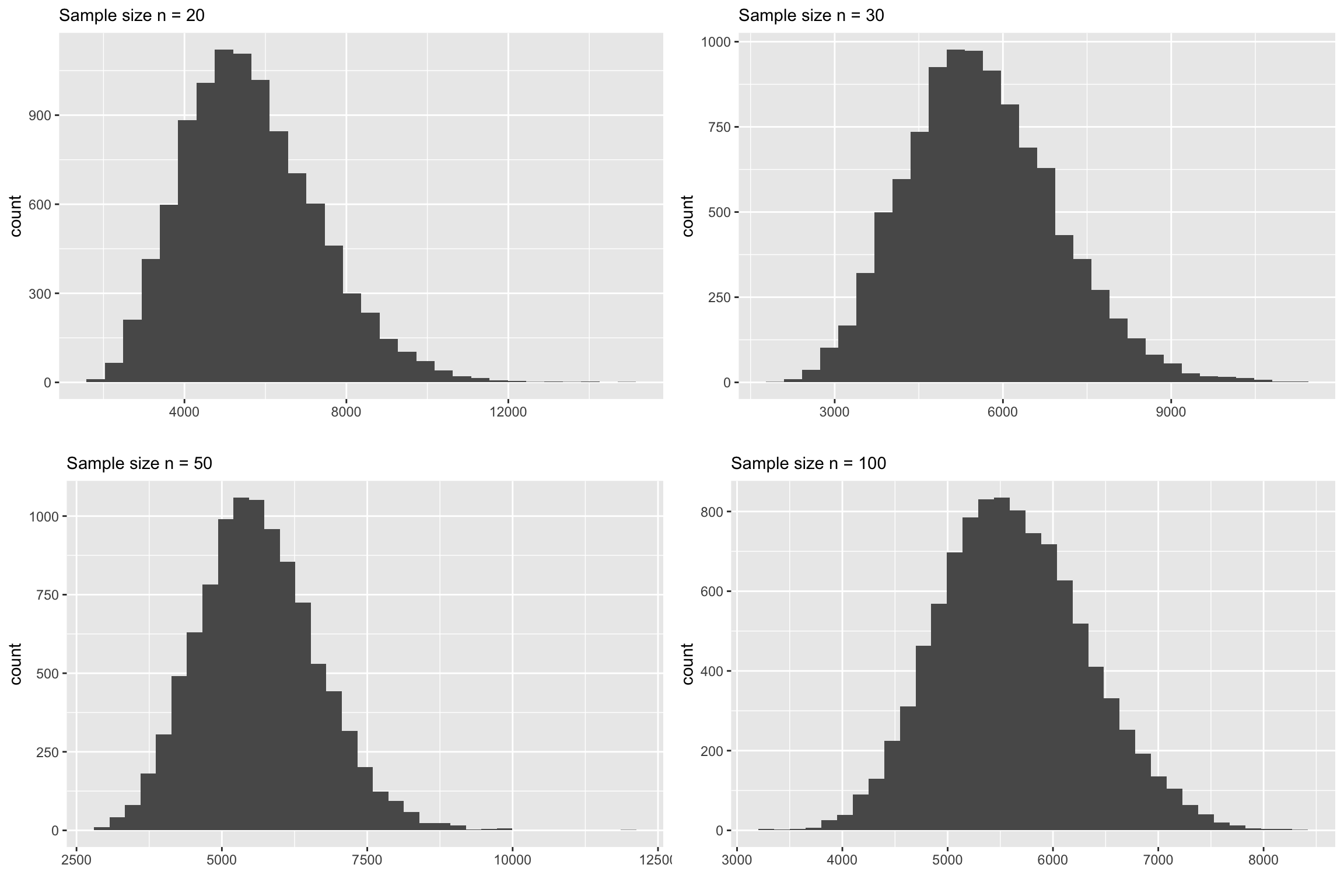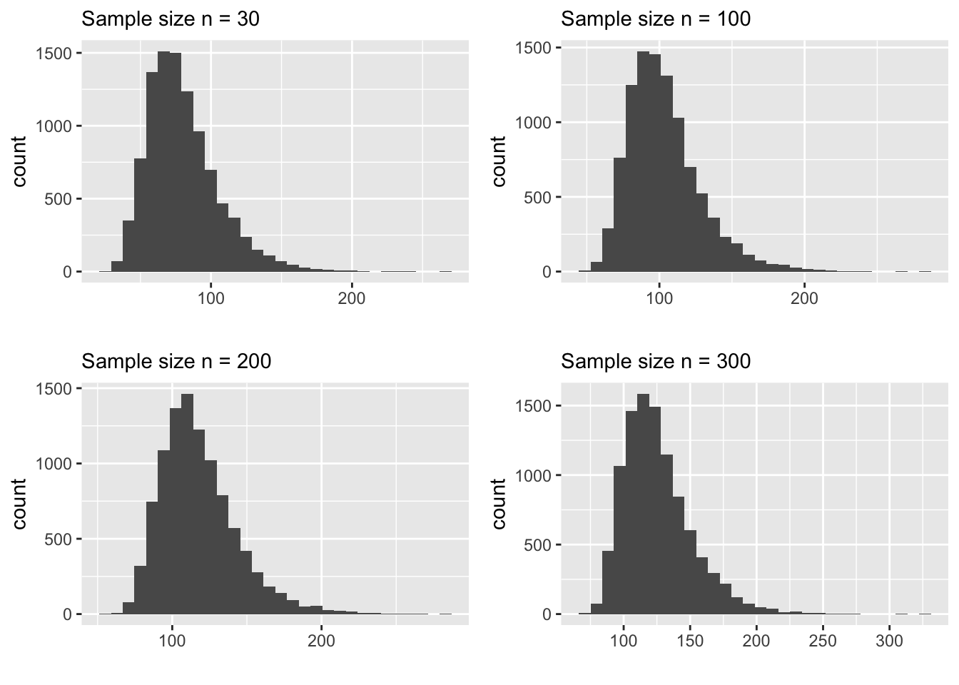 You can clearly see that none of the above plots look normally distributed. Let us increase the sample size even further and see at what point it starts to look normal.