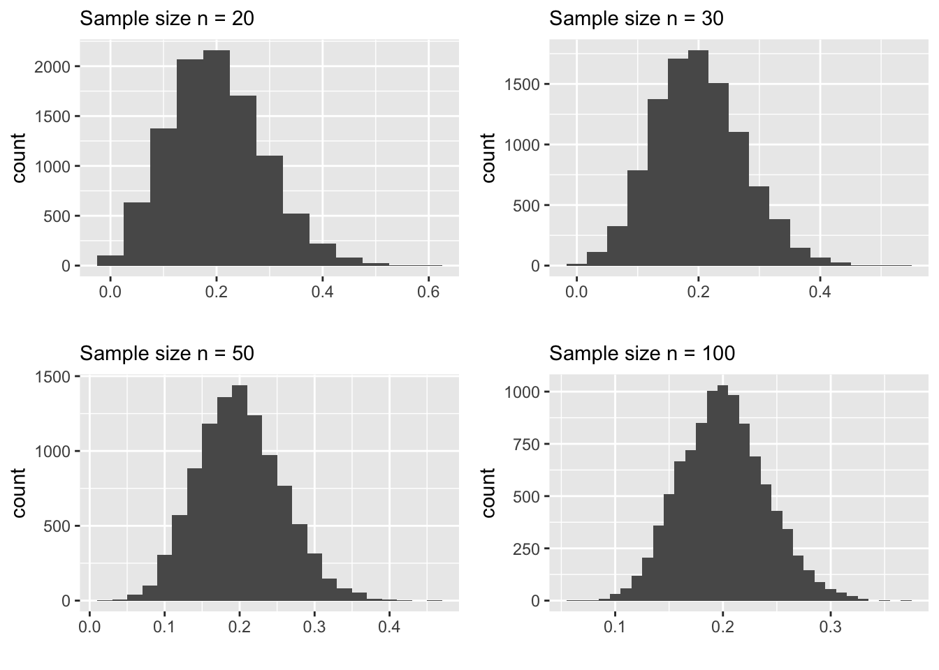 As you can see, for \(n=20\) the sampling distribution of \(\hat p\) is somewhat skewed. We can increase the sample size and see what happens to the sampling distribution.