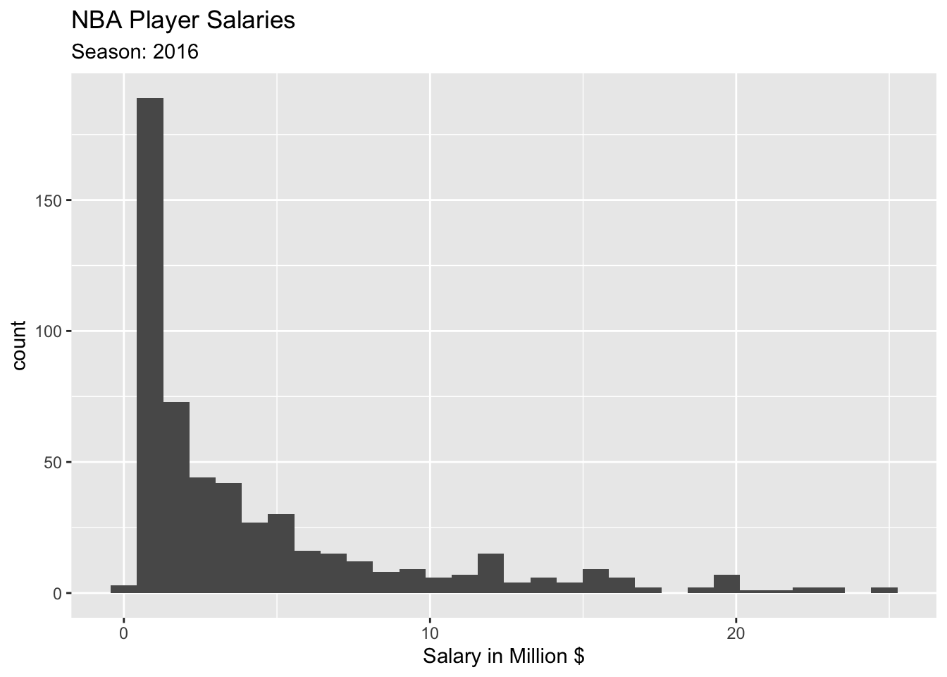 The following plots show the population distribution of NBA player salaries in 2016.