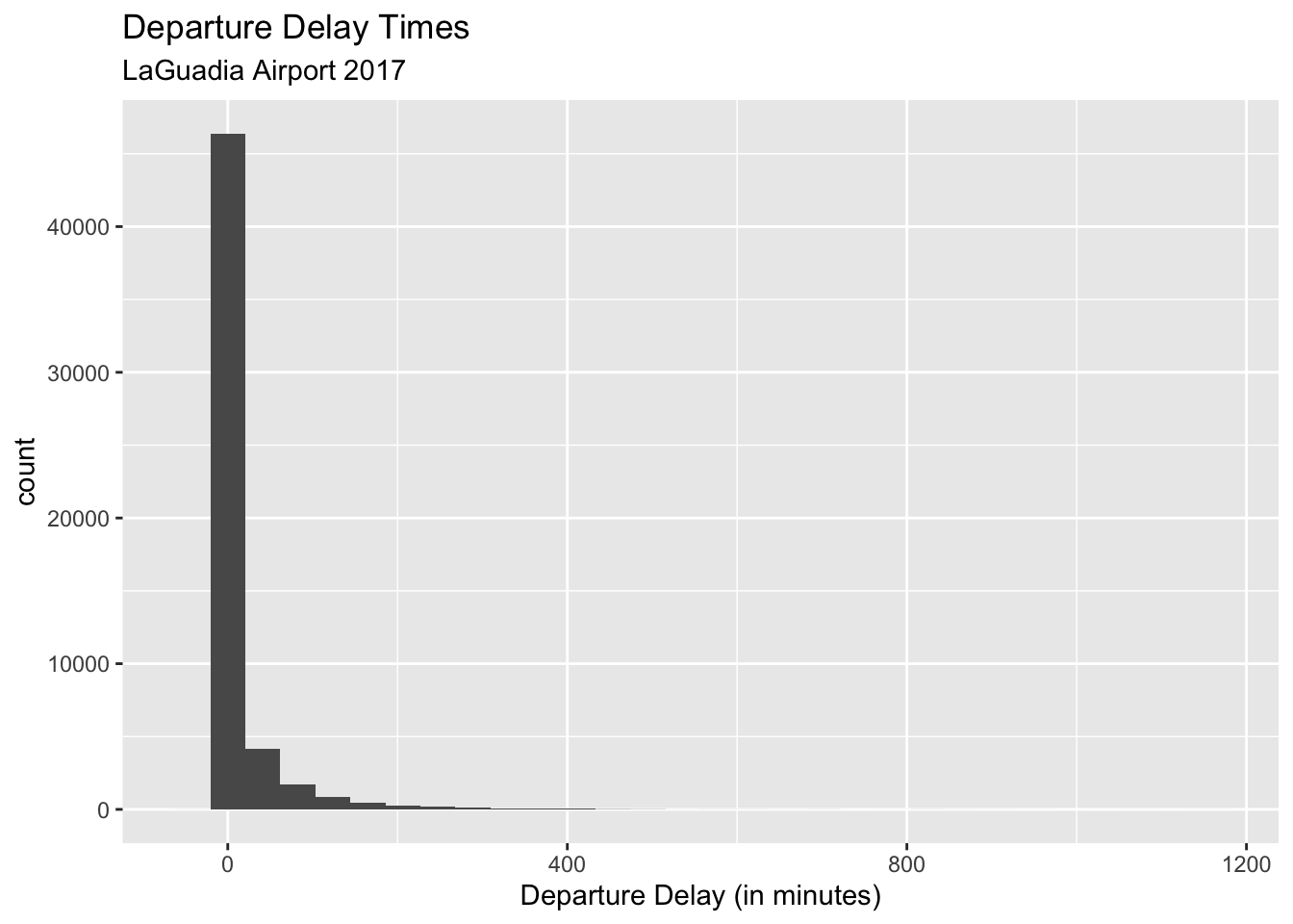The dataset we are looking at consists of ALL flights that departed from LaGuadia airport in 2017 from the three main carriers (American Airlines, Delta, and United). That is, all depatures from Jan 1 2017 to Dec 31 2017. The variable of interest is departure delay time. First, let’s take a look at the population distribution of departure delays.