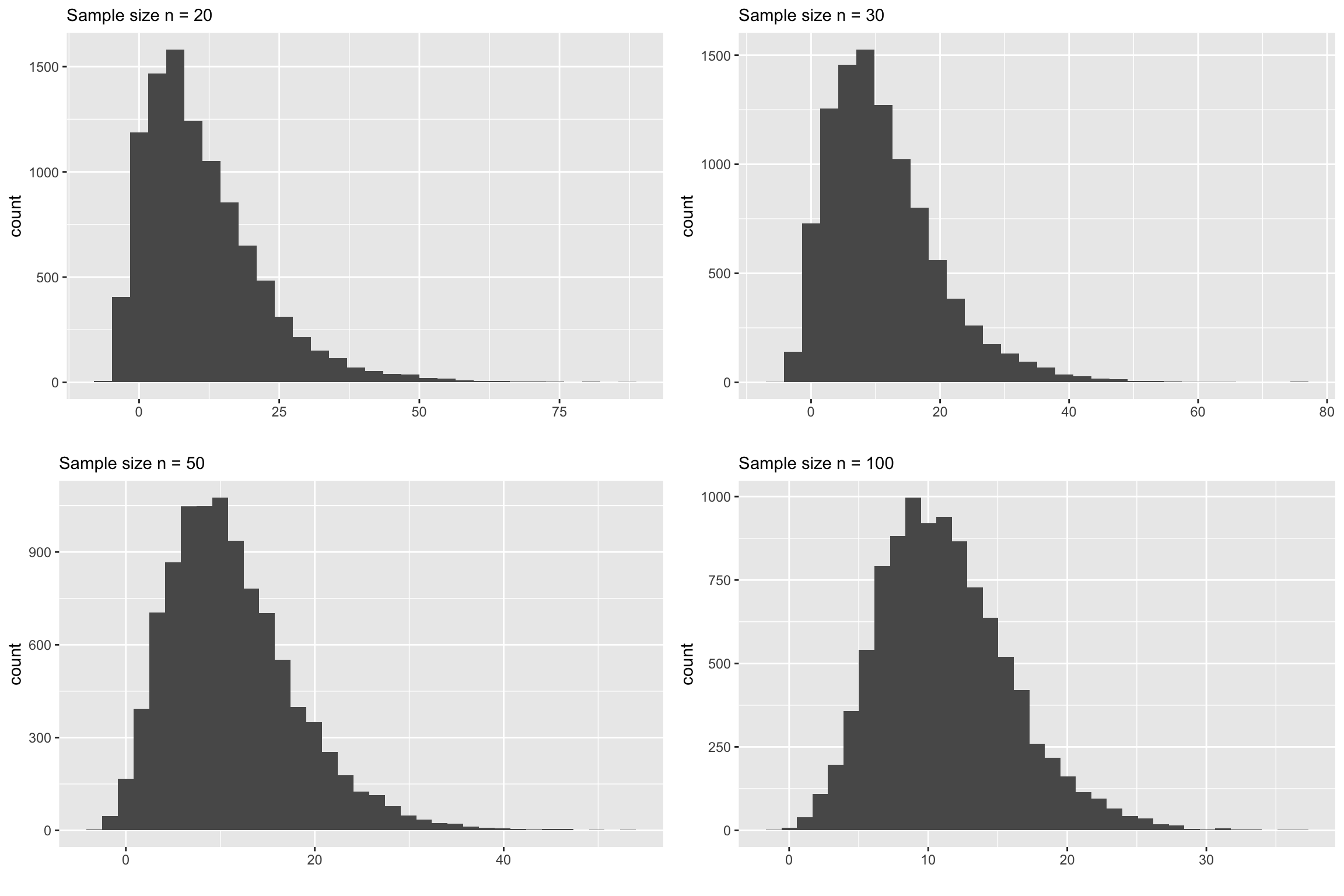 Even this example, at \(n=30\) the skewness is quite visible. At \(n=50\) the skewness is still there. Even at \(n=100\), if you look at carefully you’ll see that there is a slight skewness. So may be the rule should be \(n>100\)?