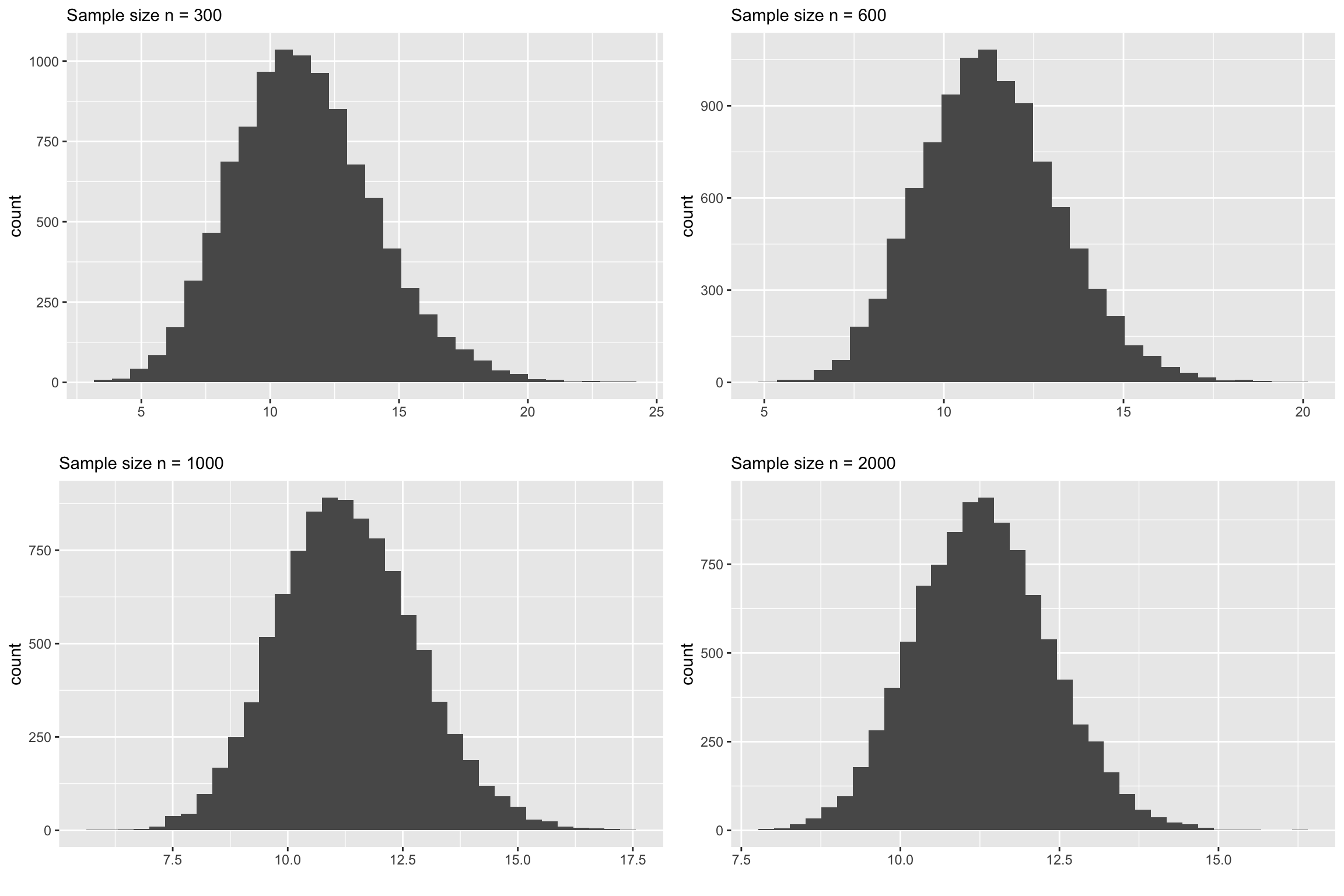 The plots below are sampling distributions of the sample maximum constructed from the same service time population (Example 2.1). Carefully look at the shape and spread of these plots.