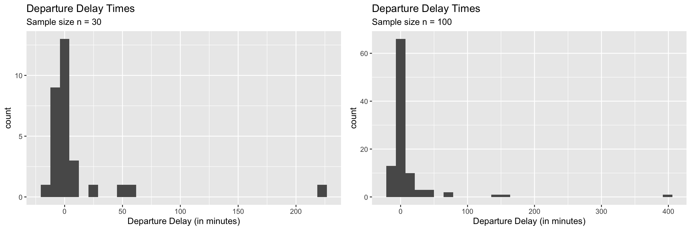 Answer: This one is tricky. Yes, we’ll never have access to the entire population. All we have is a single random sample. If our sampling process was good in capturing the variance in the population then it will provide important clues about the skeness and precence of extreme values in the popualtion. For example, here are two random sample of sizes \(n=30\) and \(n=100\) respectively from the flight delay example.